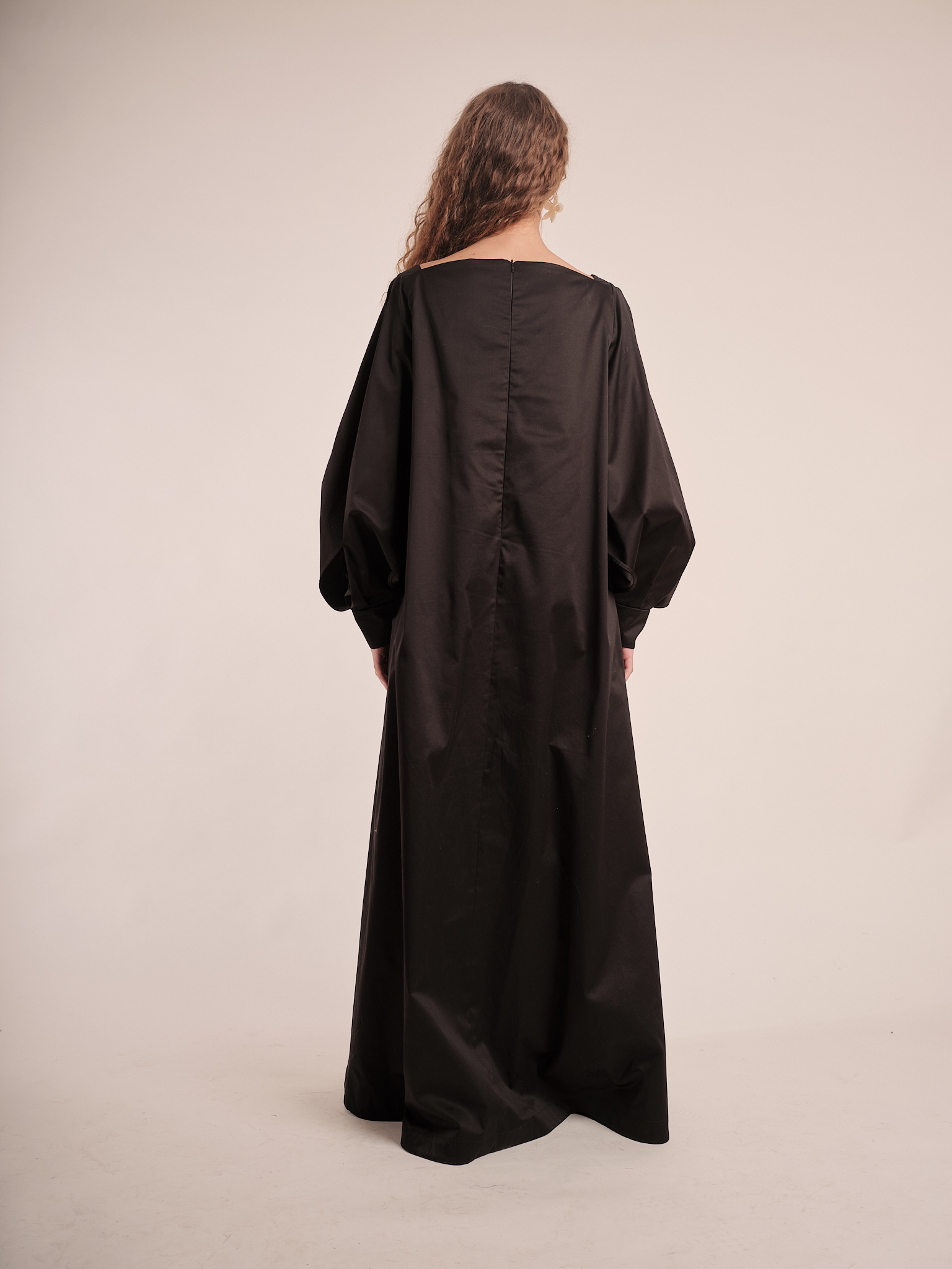 Made from black cotton satin it has a A-lined silhouette with rounded decolletage. The design has long baloon styled sleeves with cutout details.