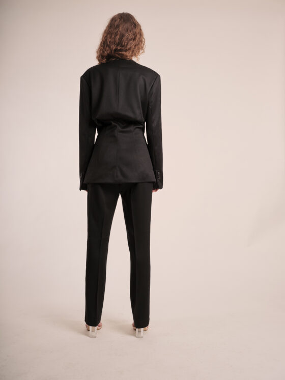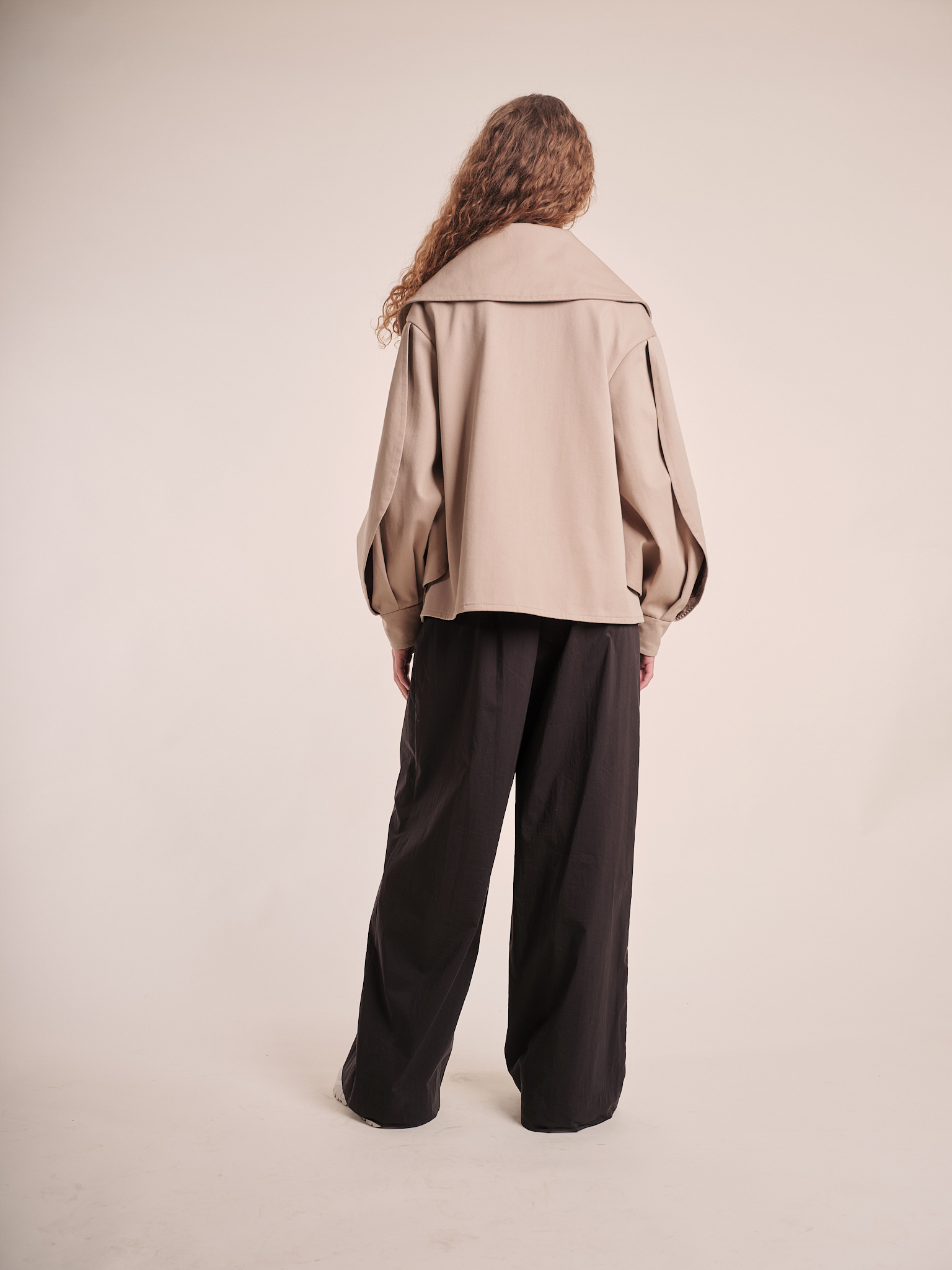 This cropped version of the classic outerwear style from weather resistant cotton gabardine features double breasted front, long balloon styled sleeves with cutout details, generously sized notch lapels and big slit pockets.
