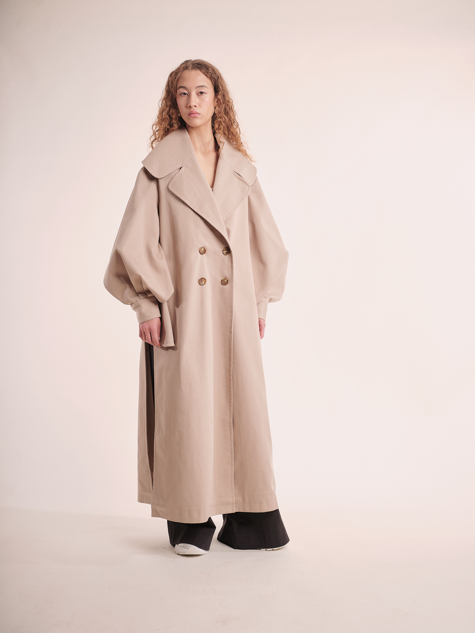 Made in Italy from weather resistant cotton gabardine, this belted doublebreasted coat features long balloon styled sleeves with cutout details, generously sized notch lapels and big slit pockets.