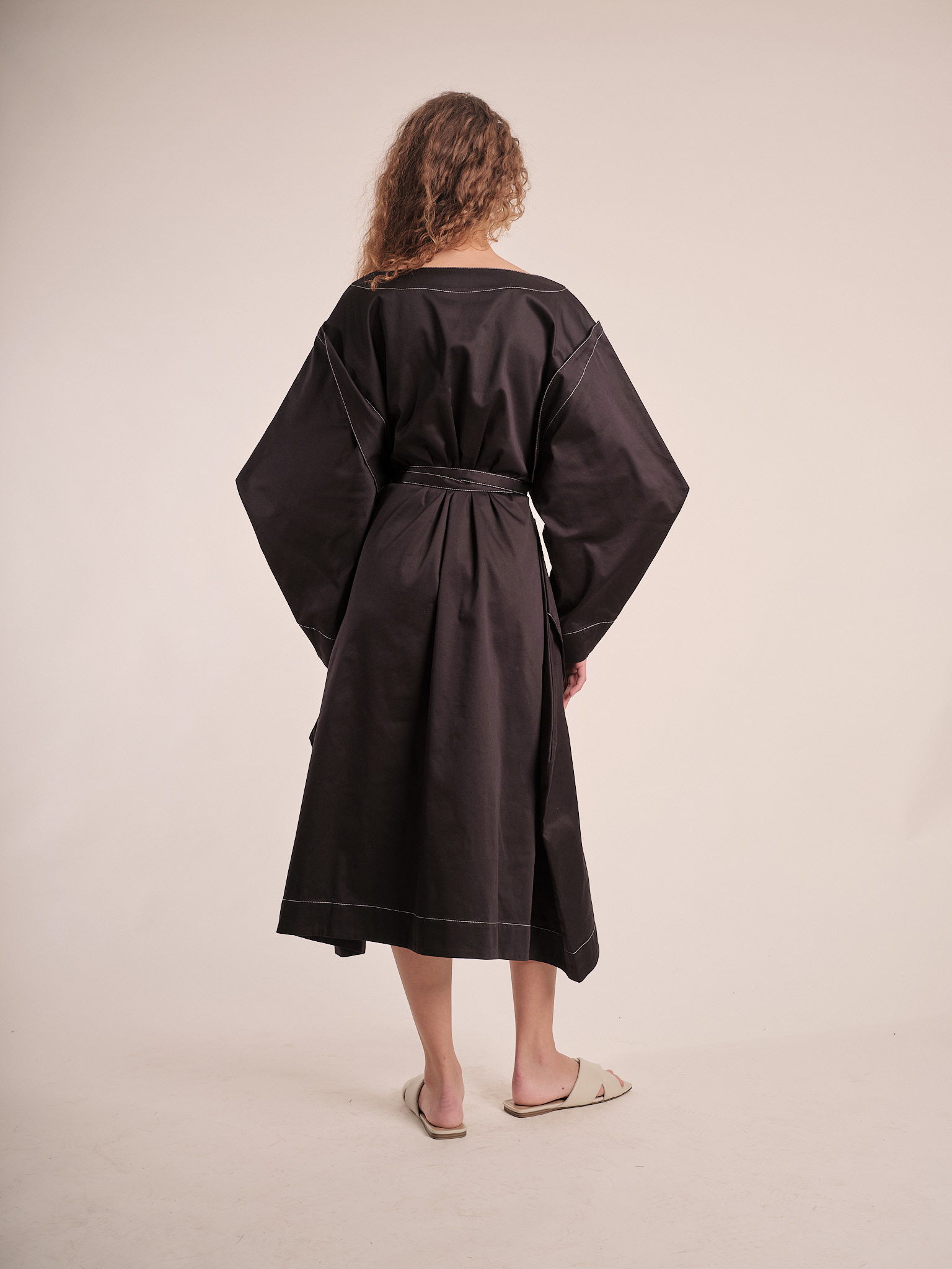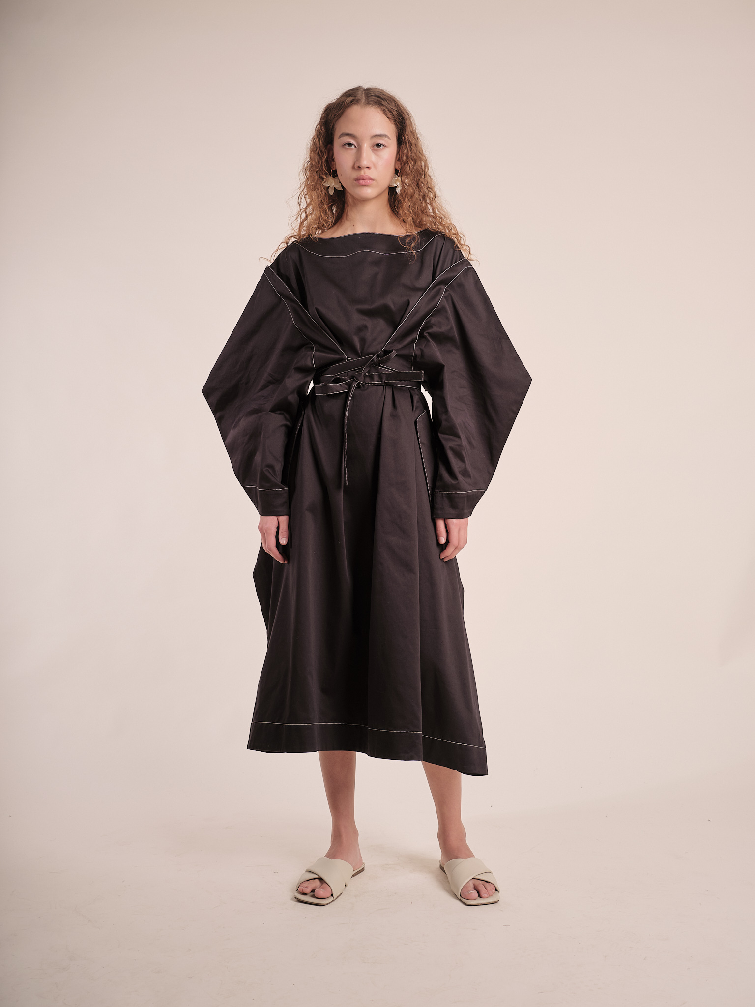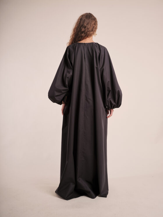 This italian cotton satin dress comes with big voluminous sleeves and a ribbon style belt attached.