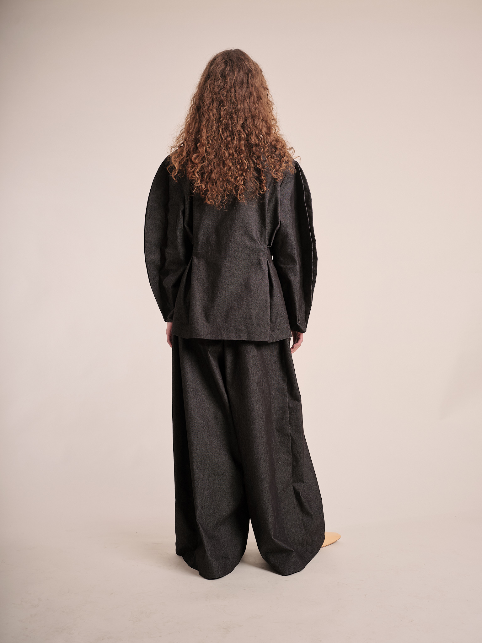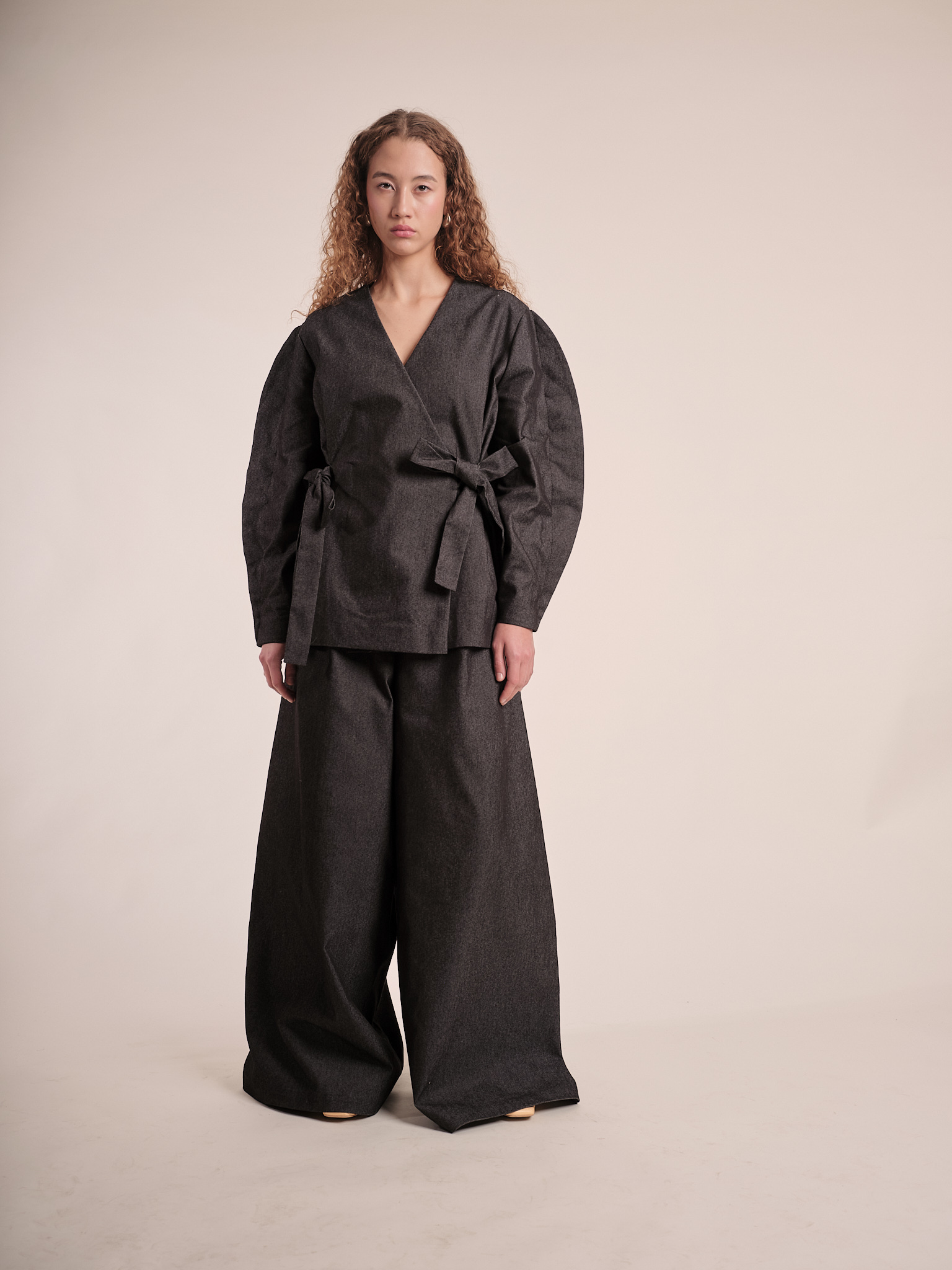 This belted blazer has a wrap-front silhouette with bow details in the front, rounded shoulders and collarless neckline.