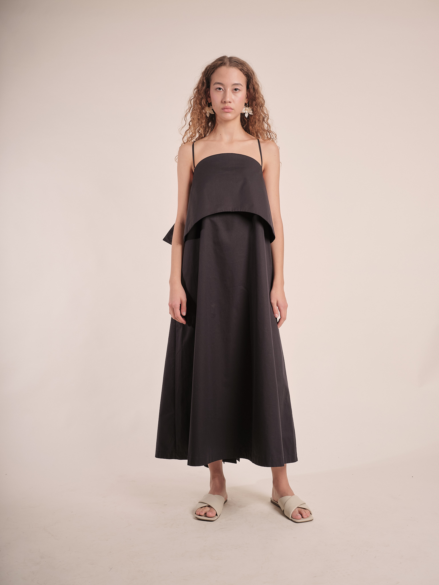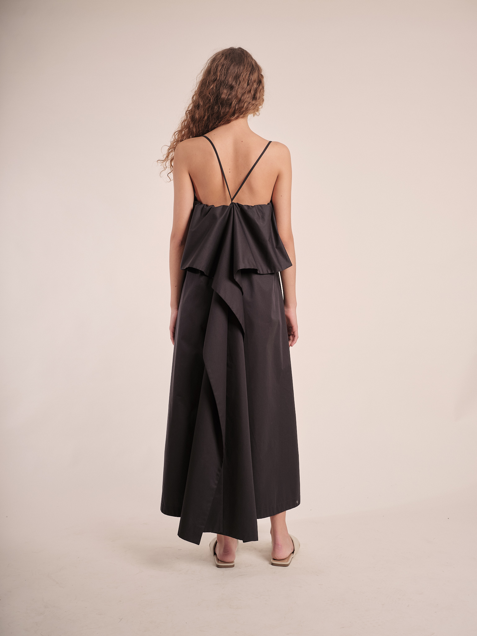 This silk blend maxi dress has an empire line hidden under rounded decolletage detail that flows into A lined skirt. The design is finished with spaghetti shoulder and an open back.
