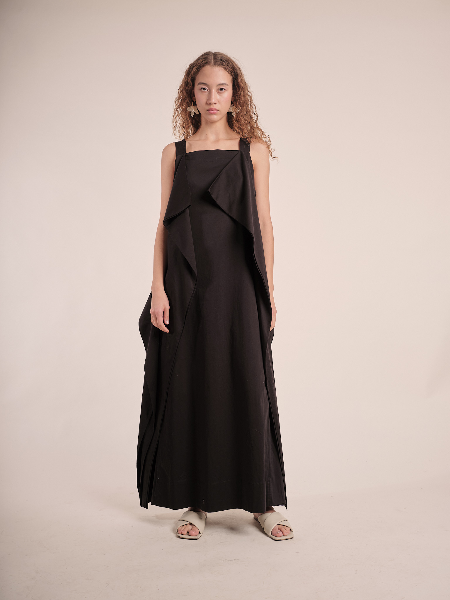 This cotton satin sleevless dress has a slightly loose fit around the bodice. It comes with wide straps, voluminous volants on the sides and side slit pockets.