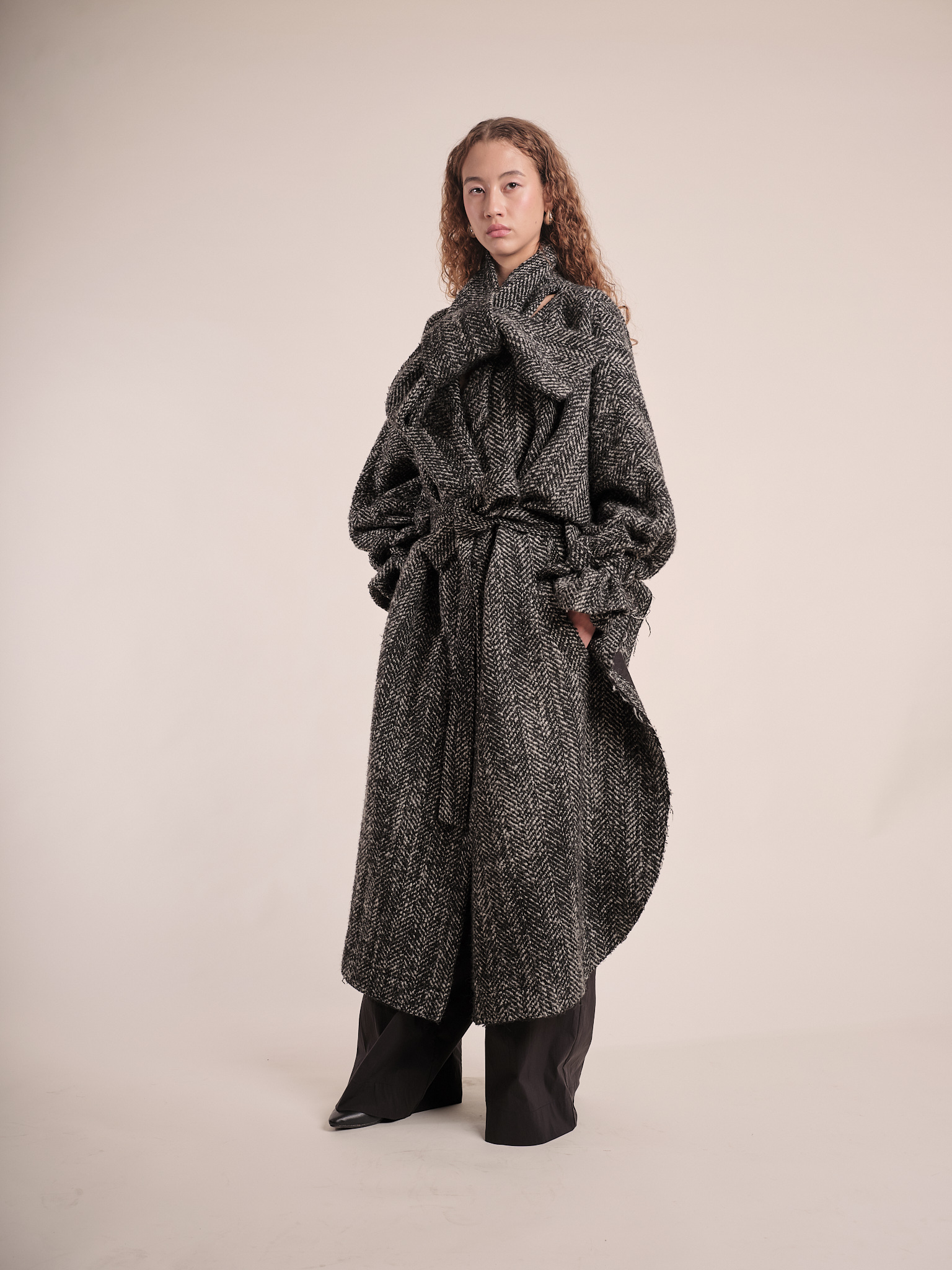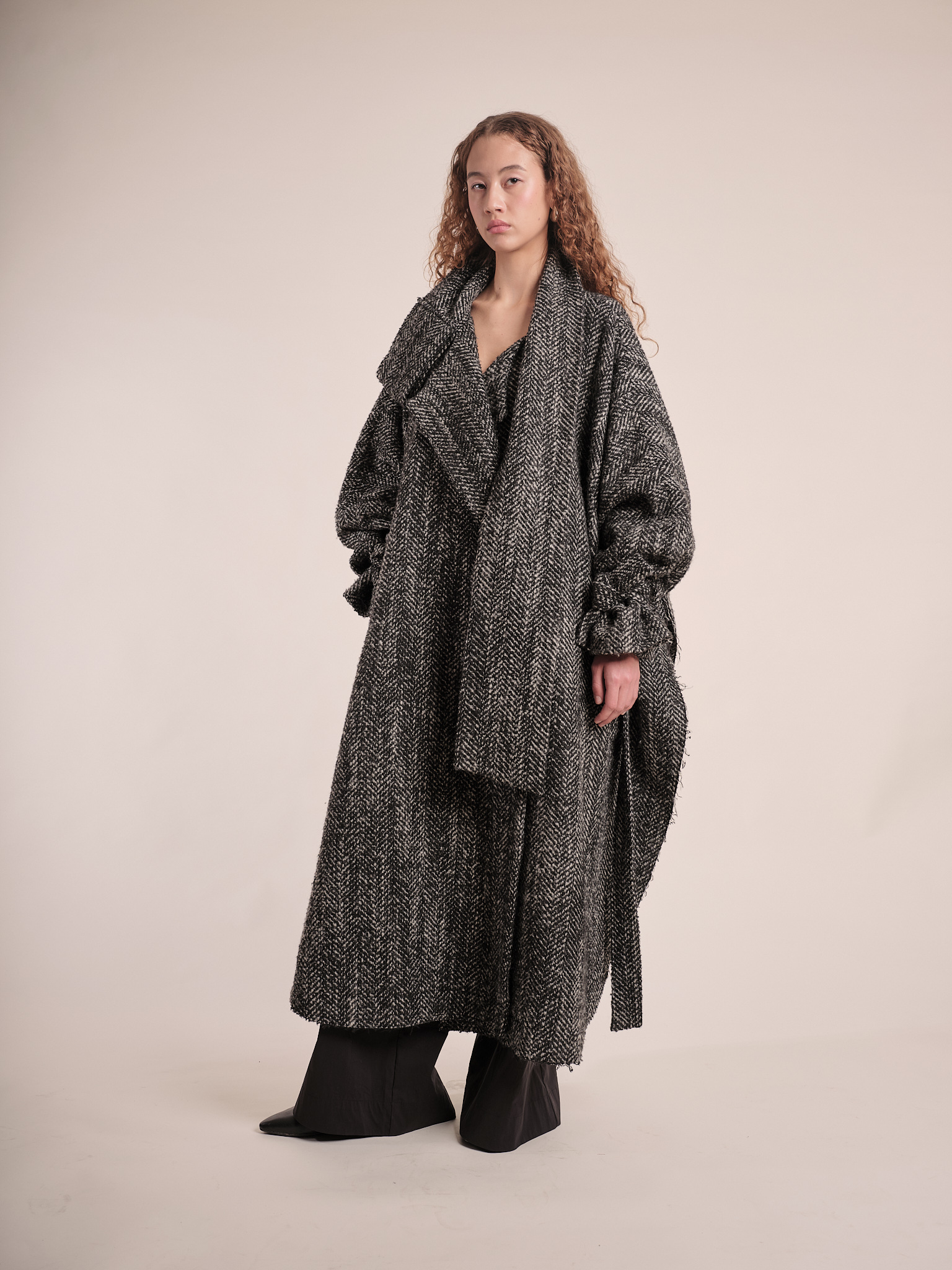 Made from wool this style features wide sleeves with ribbon closure, neckline scarf detailing and a self tie belt that accentuates the waist.