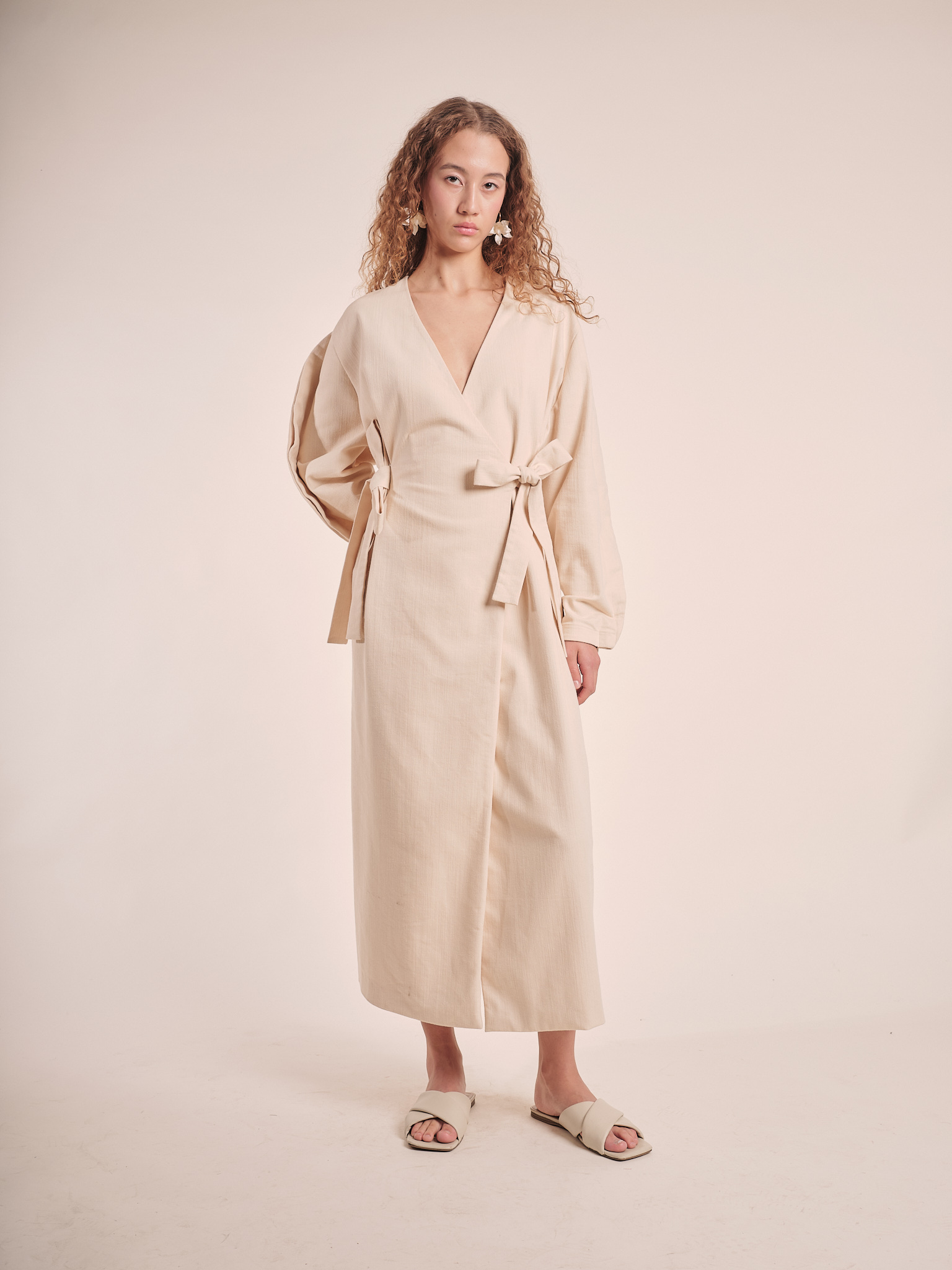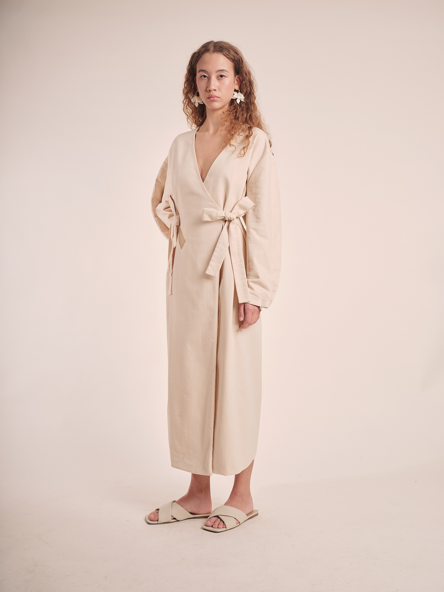 closure: wrap-front silhouette with a bow detail